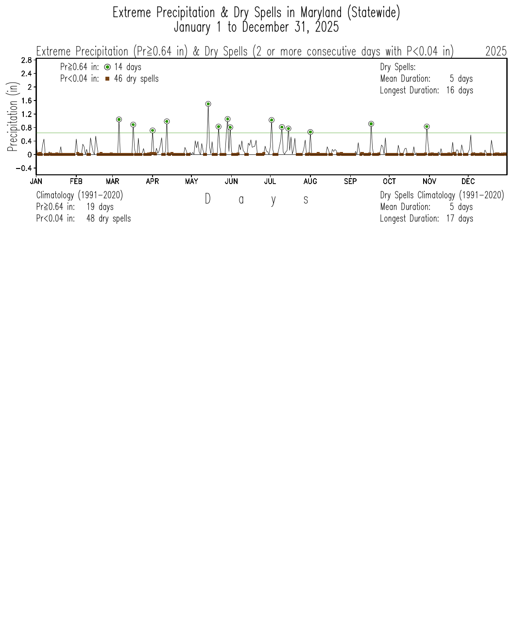 Dry spells (consecutive days with daily total precipitation less than 0.04 inches) in the calendar year are shown as brown-filled squares, while extreme precipitation days (precipitation equal to or larger than the 95th percentile of daily precipitation in the period 1951-2000) are displayed as green-filled circles. The green horizontal line in each panel marks the extreme precipitation threshold.