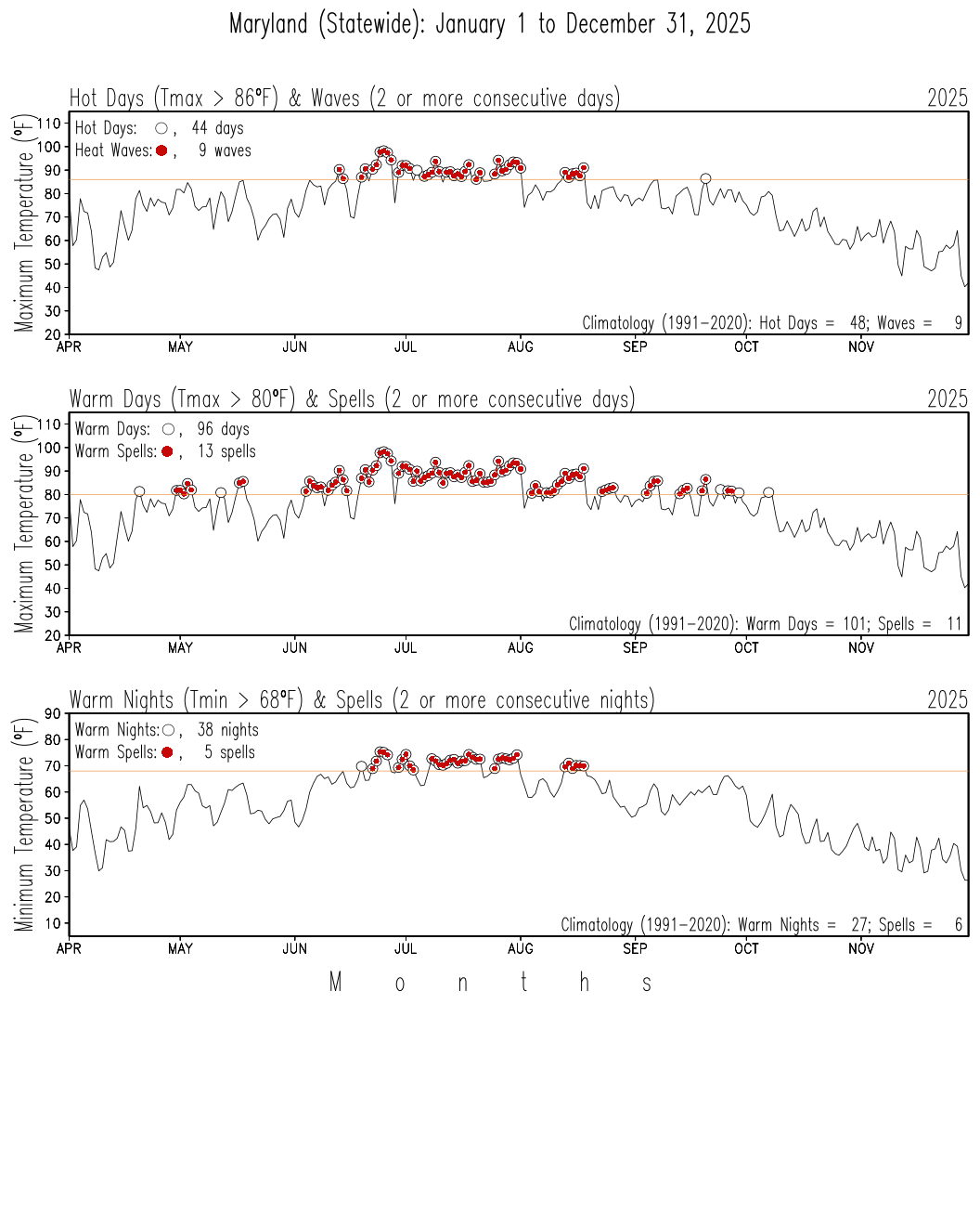 This analysis identifies Hot Days as those whose daily maximum temperature is larger than 86°F; Warm Days (summer days in the literature) as those whose daily maximum temperature is larger than 80°F; and Warm Nights (tropical nights in the literature) as those whose daily minimum temperature is larger than 68°F. If these days/nights occur for two or more consecutive days they define a Heat Wave, a Warm Day Spell, and a Warm Night Spell, respectively. Summary tables can be seen in the following links for Hot Days, Warm Days, and Warm Nights.